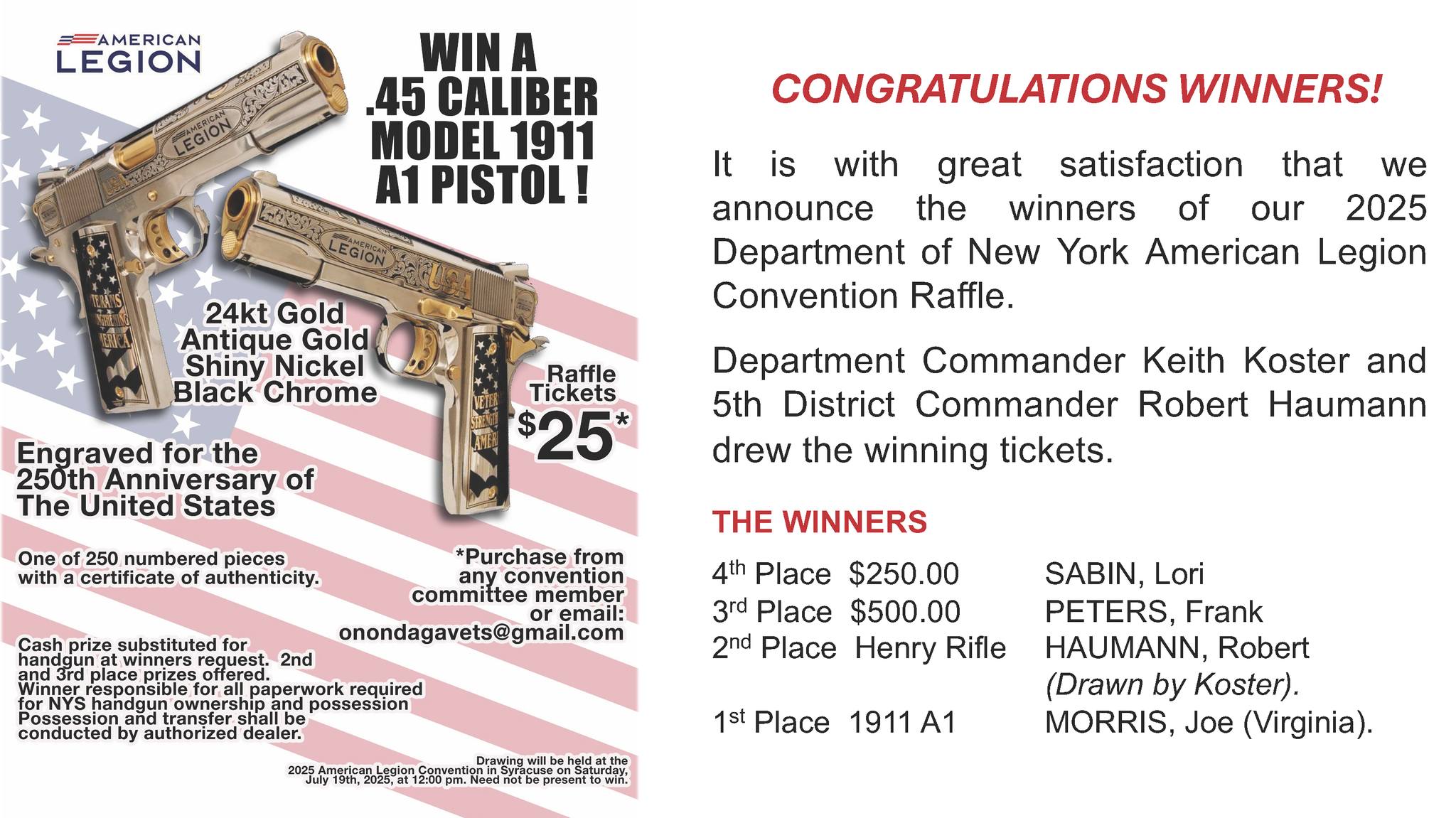 January 19th, 2026 – Albany, NY Congratulations to Legionnaire Kenneth Weaver from the Seager-Werner Post 333 in Nunda, NY, for winning the 2026 Mid-Winter 50/50 Raffle.