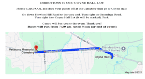 Parking will be tigt so Centro has volunteered to Shuttle people from OCC’s Coyne Hall starting at 7:30 am that date. You may drop people off at the Cemetary but then bring your car to the lot for parkling and shuttle back. Additional Information:Wreaths Across American Veterans Cemetary .