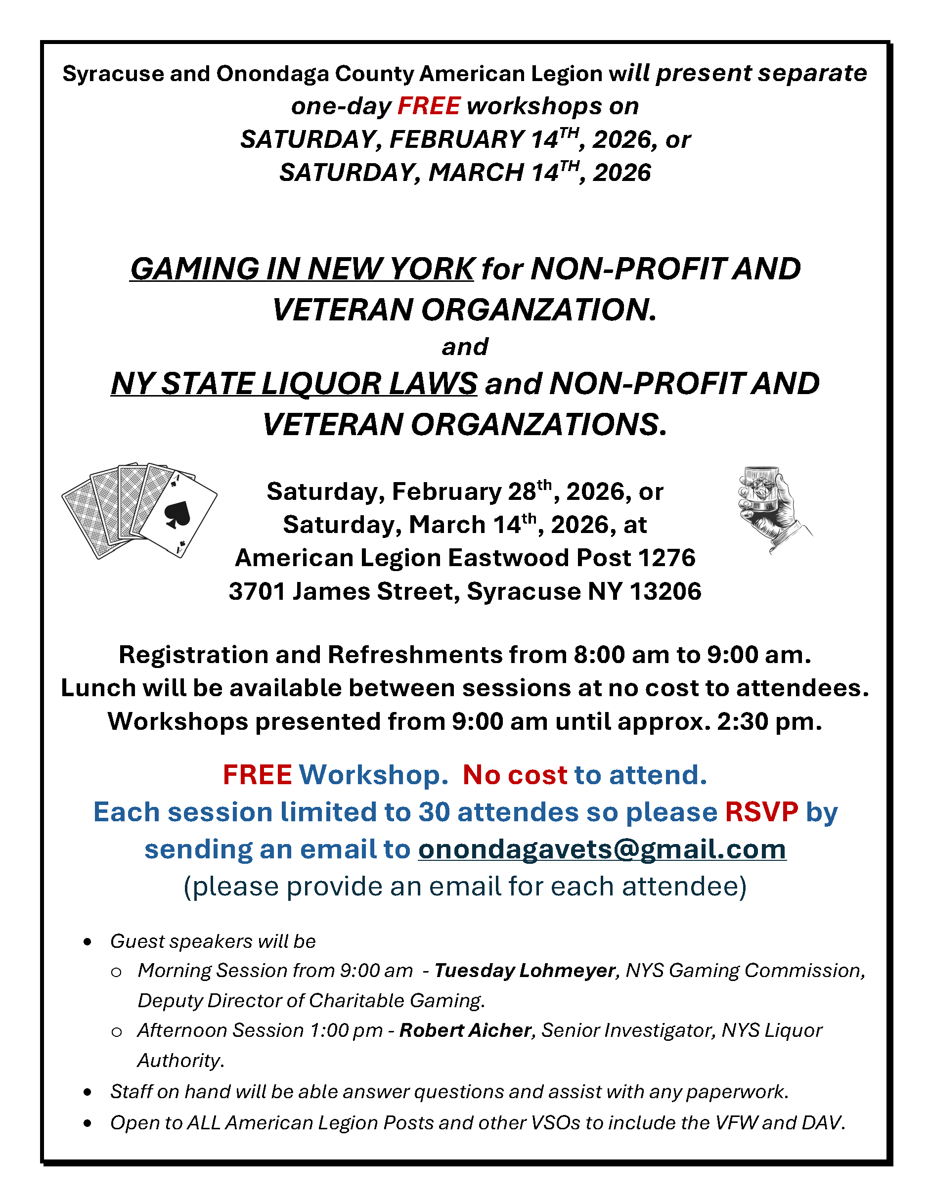 The 108th American Legion Department of New York Convention will be held in Syracuse again this year. Please see our WEBSITE at SYRACUSE AMERICAN LEGION.COM for updated convention information.